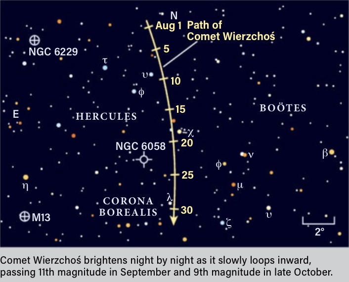 Comet C/2024 E1 (Wierzchos´) is passing through the constellation of Hercules this month shining around 12th magnitude, so a 10 inch scope or greater and dark skies will be needed to view it.