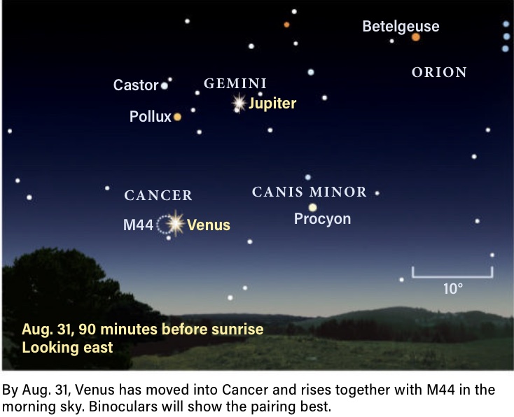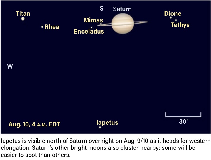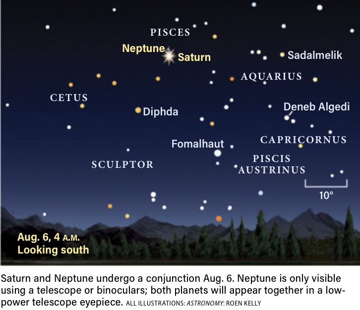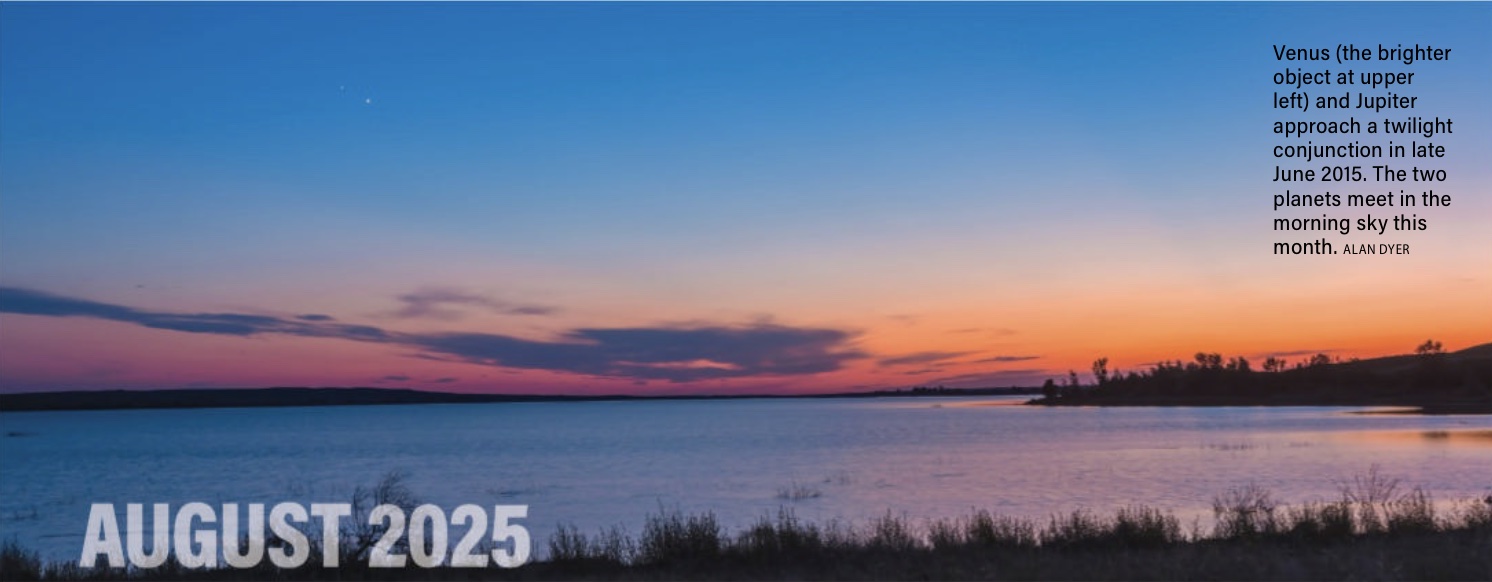 "The longer nights of August beckon with several treats this month. Saturn and Neptune undergo their second conjunction of the year, appearing together in a low-power telescope eyepiece. Telescopic observers also get two shadow transits of Titan across Saturn. Early risers enjoy a spectacular conjunction of the two brightest planets in the sky, Venus and Jupiter, on Aug. 12, the same day the Perseid meteor shower peaks." Astronomy Magazine, August 2025, p.28.