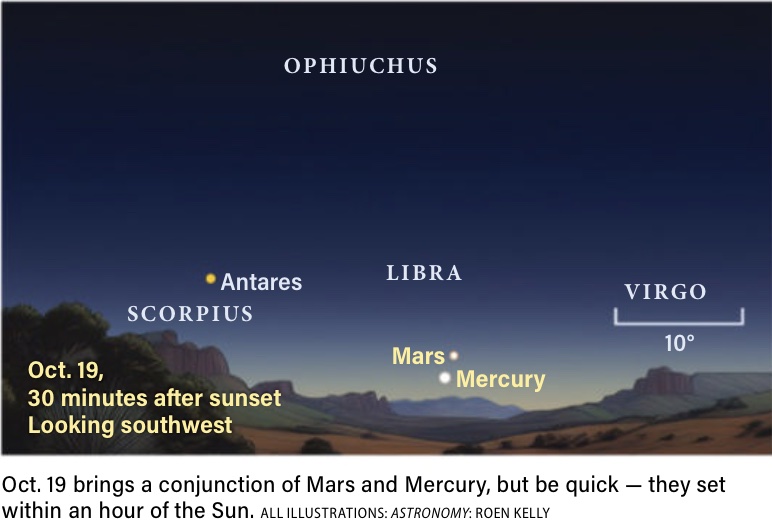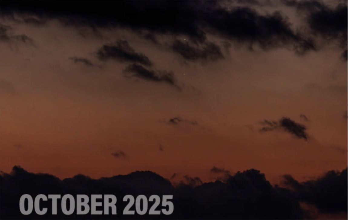 "Mercury (top) and Mars appear in a patch of clear sky near the top of this photo during their 2024 conjunction. This month brings another meeting of the two planets." Astronomy Magazine, October 2025, p. 28. - GIANNI TUMINO