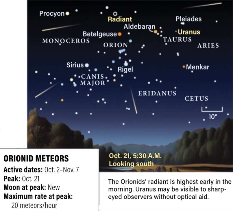 "October's longer nights bring two transits of Titan across Saturn, while Io and Europa tango together across Jupiter three times. Mercury and Mars make a brief evening appearance, and Venus dominates the morning sky. Plus, the fine Orionid meteor shower occurs during the dark of the Moon." Astronomy Magazine, October 2025, p.28.
