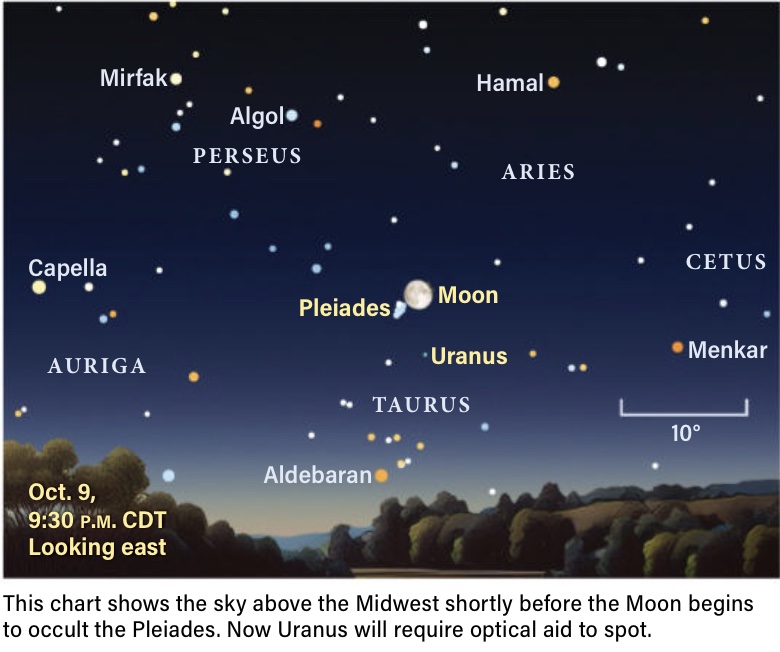 Rises at about 8:58 p.m. on the 1st and about 6:53 p.m. by month's end. Look for Uranus to the southeast in the late evening. Uranus is in the constellation Taurus shining at magnitude 5.6.